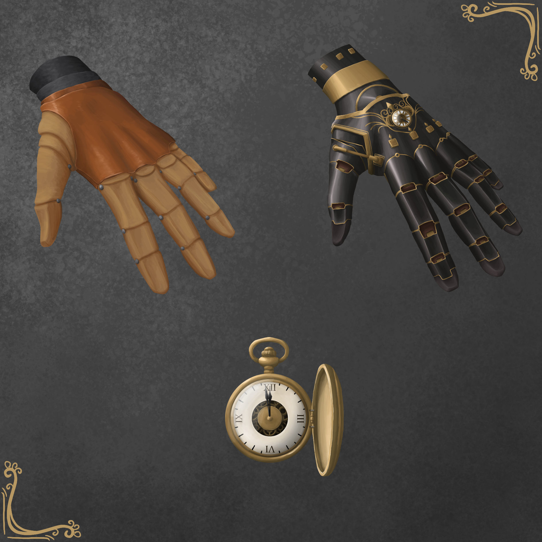His old wooden and copper hand (left), his new and improved hand of his own design (right), and his favourite pocketwatch that gifted to him long ago