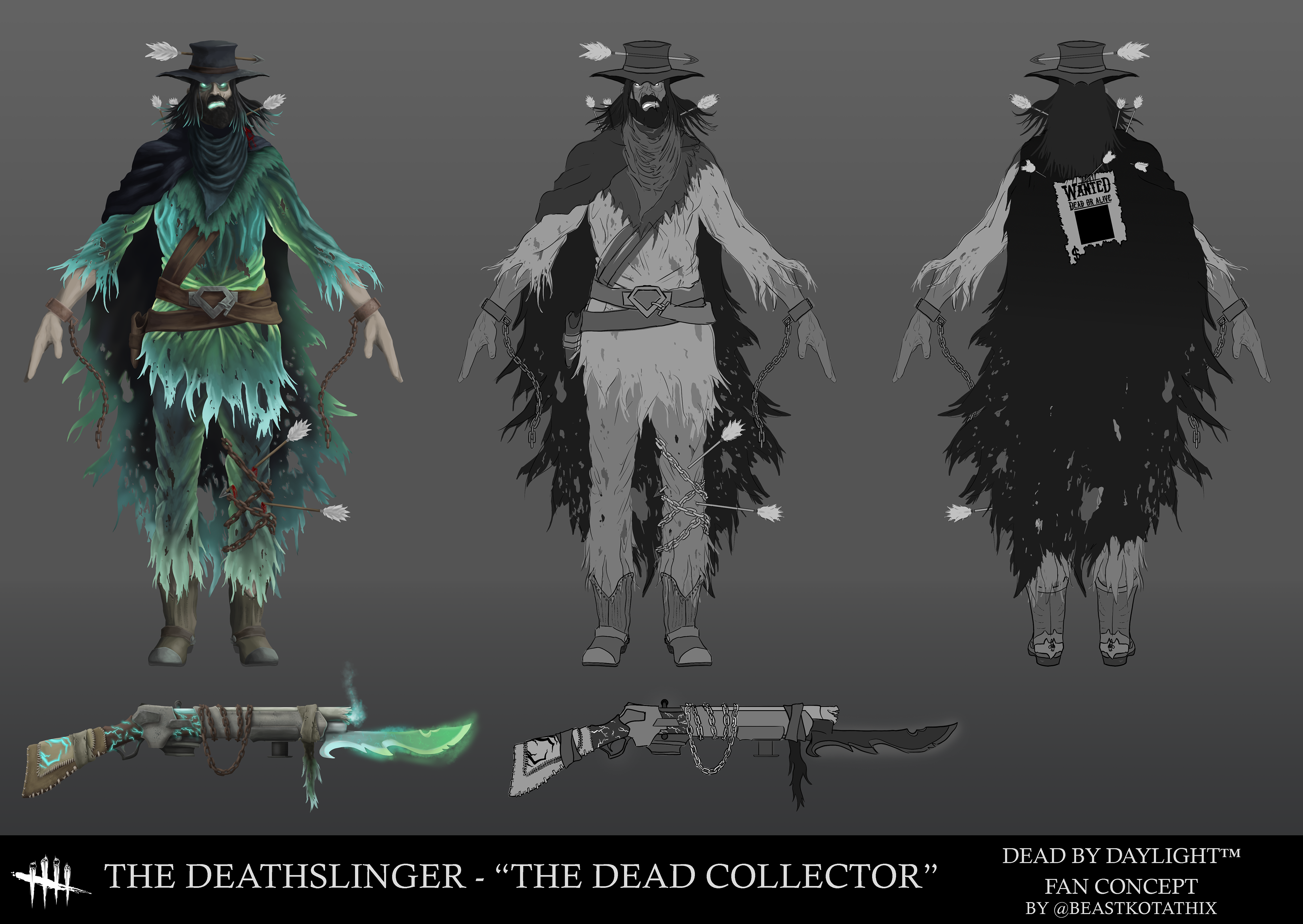 My killer of choice was The Deathslinger, and I created this piece which I dubbed "The Dead Collector" after the idea that in some alternate timeline, Caleb Quinn was out on the hunt, and instead of finding the bounty to be claimed, he found arrows in his neck and back instead, with his murderer pinning the wanted poster on his back as a mocking gesture at his defeat. Instead of staying dead, something dragged his soul back to his body and granted him the chance to avenge himself in the Entity's realm.